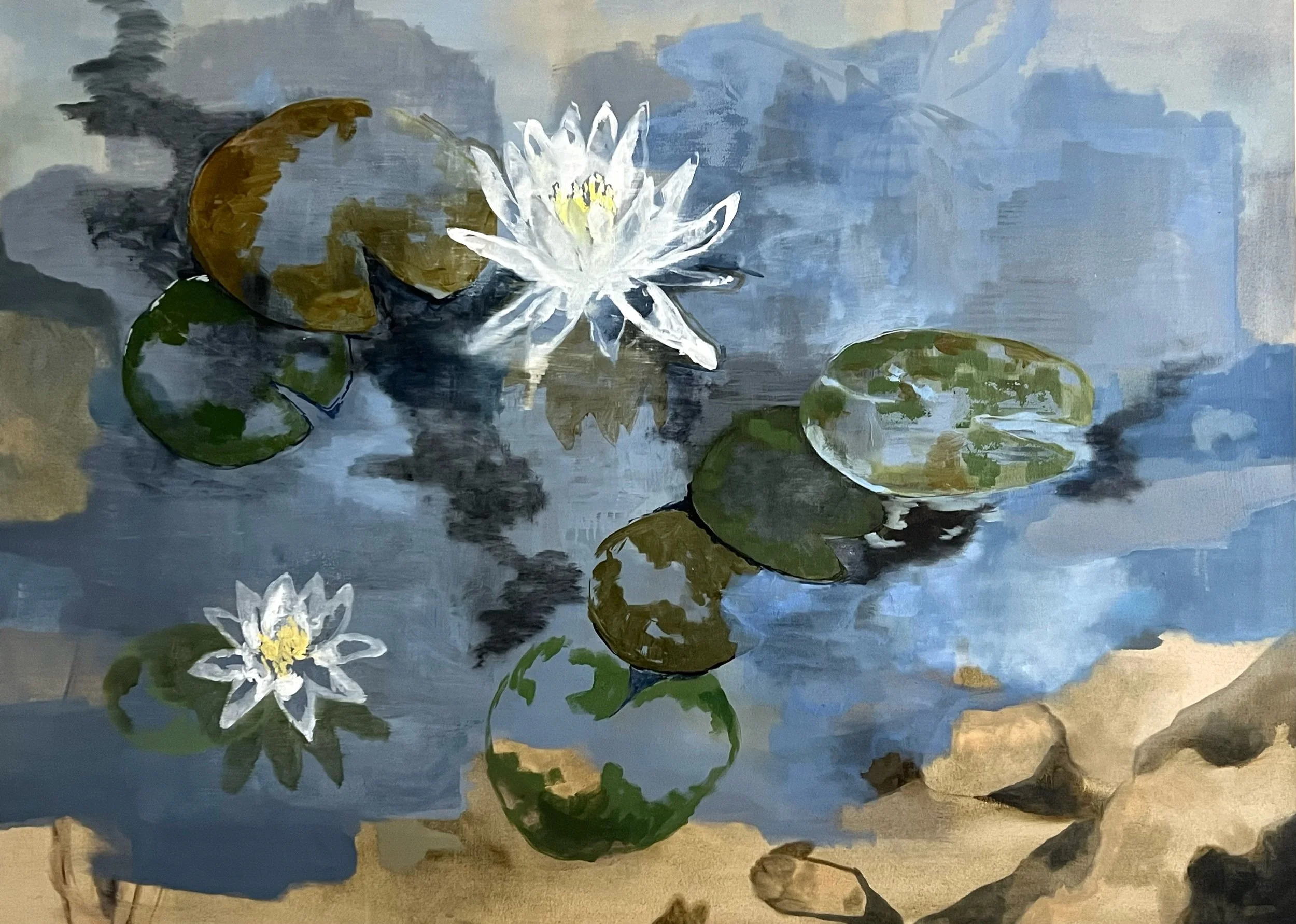 This original oil on canvas offers a modern dialogue with Claude Monet’s iconic water lily series. The piece captures the complex, layered reality of the pond, focusing simultaneously on the shimmering reflection of the sky and clouds on the water's surface and the deep, submerged colors beneath. Executed with bold, loose brushstrokes in a serene palette of blues, greys, and earthy greens, the painting is anchored by unique flashes of gold and bronze—a distinctly contemporary finish that elevates the classic subject matter beyond Impressionism. This work is an elegant meditation on light, depth, and the quiet beauty of a water garden.