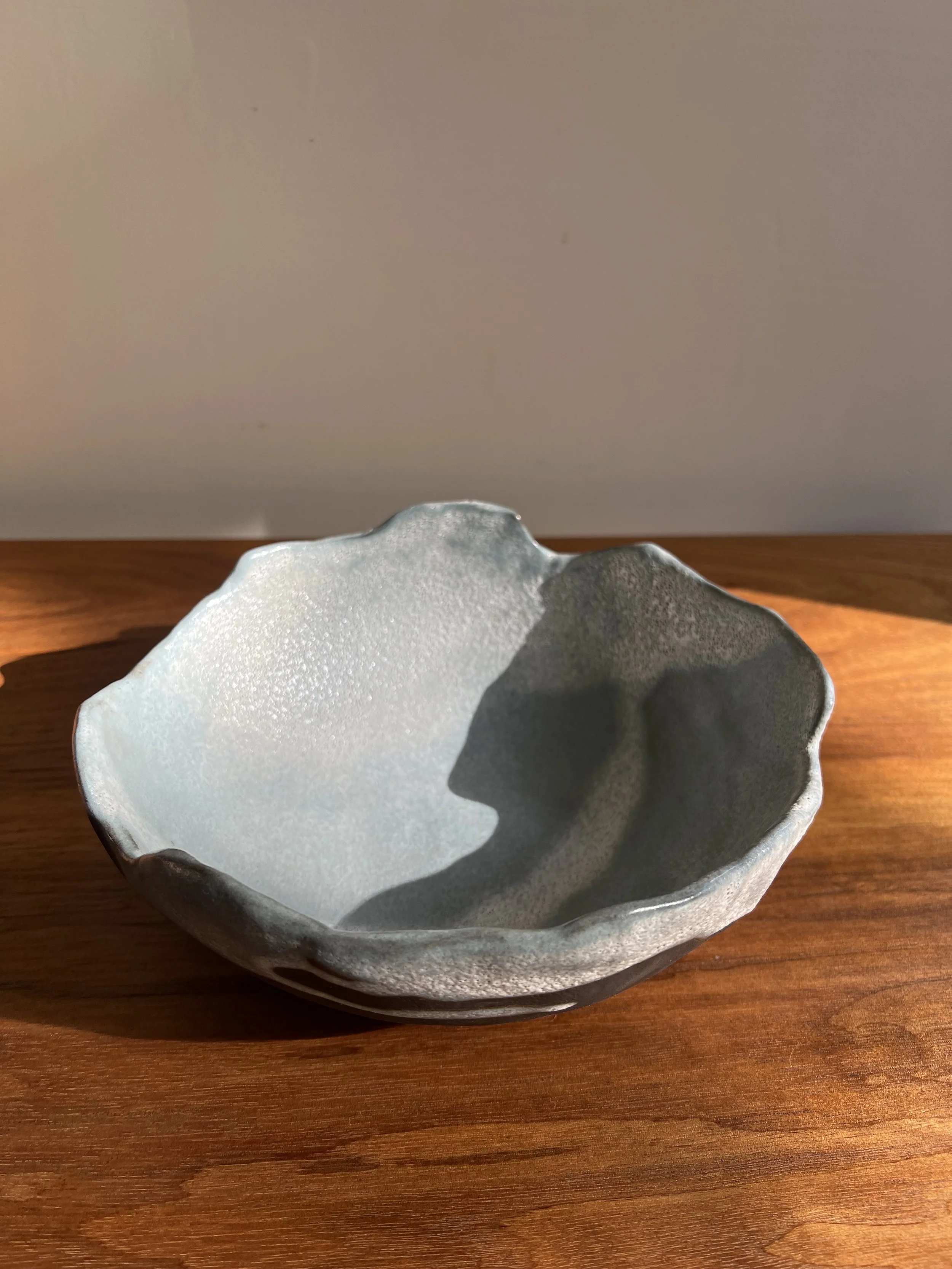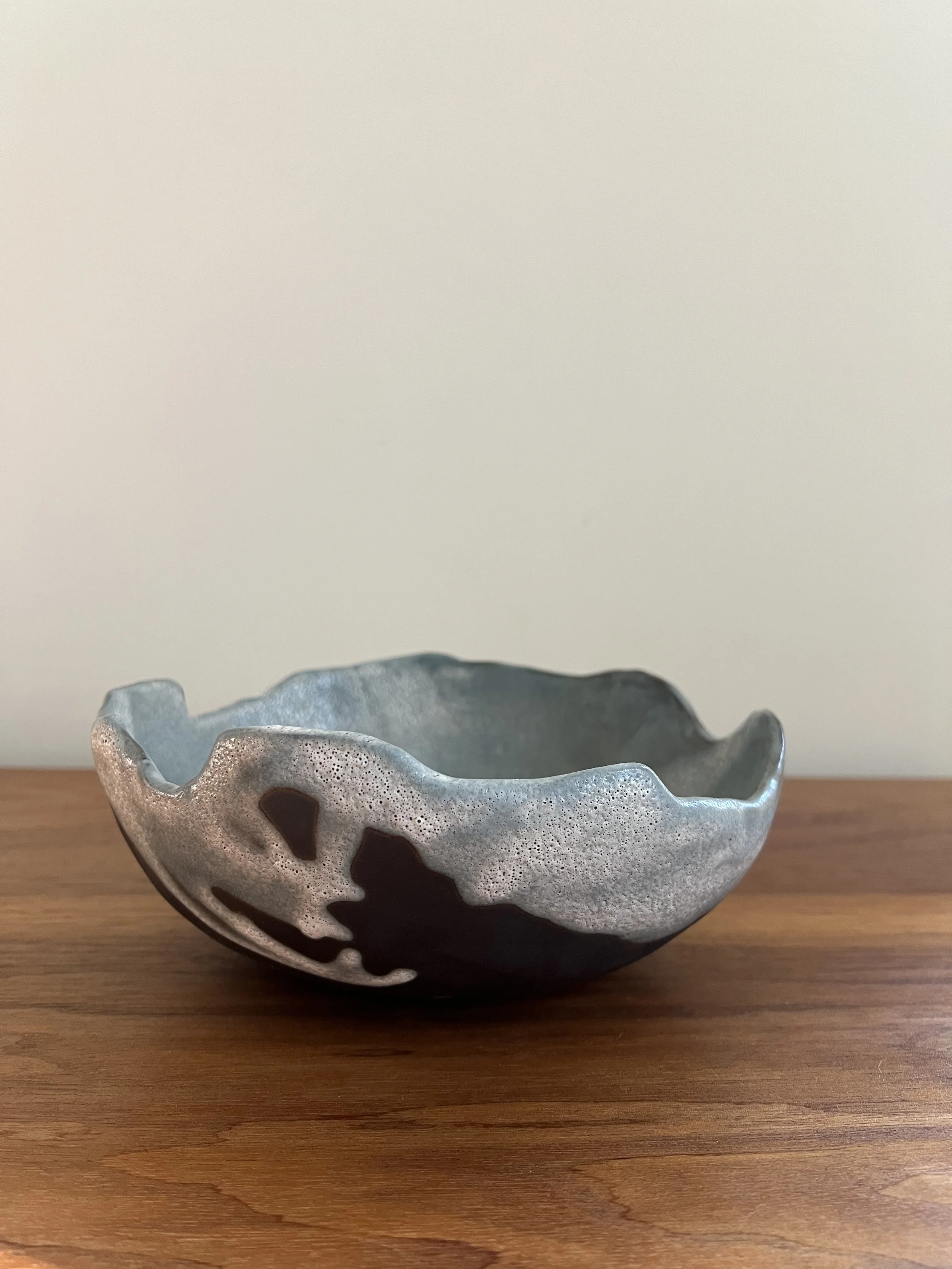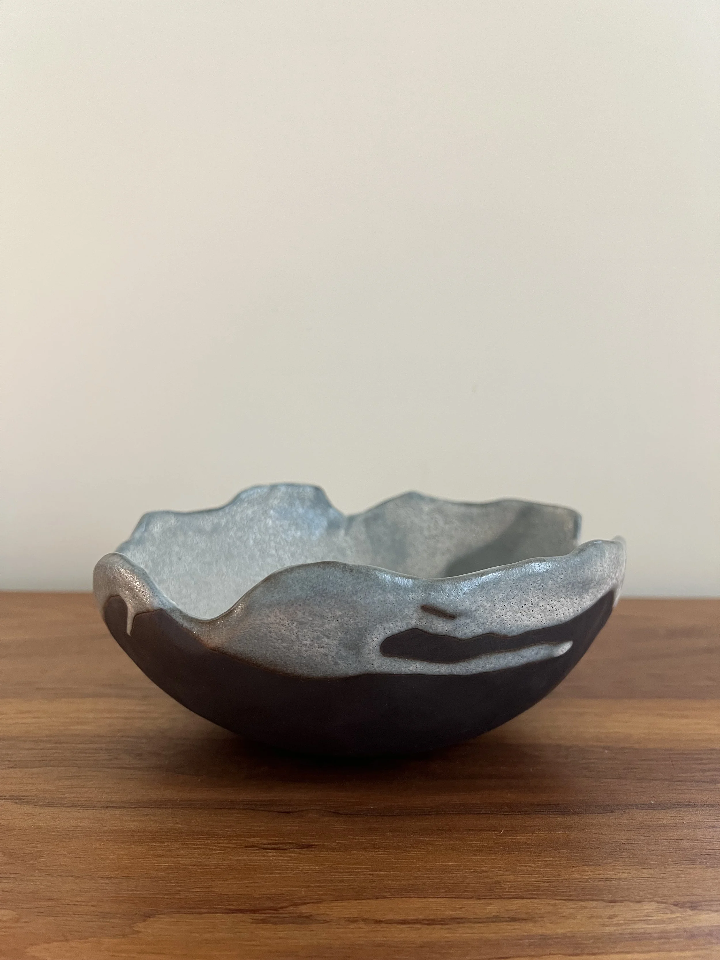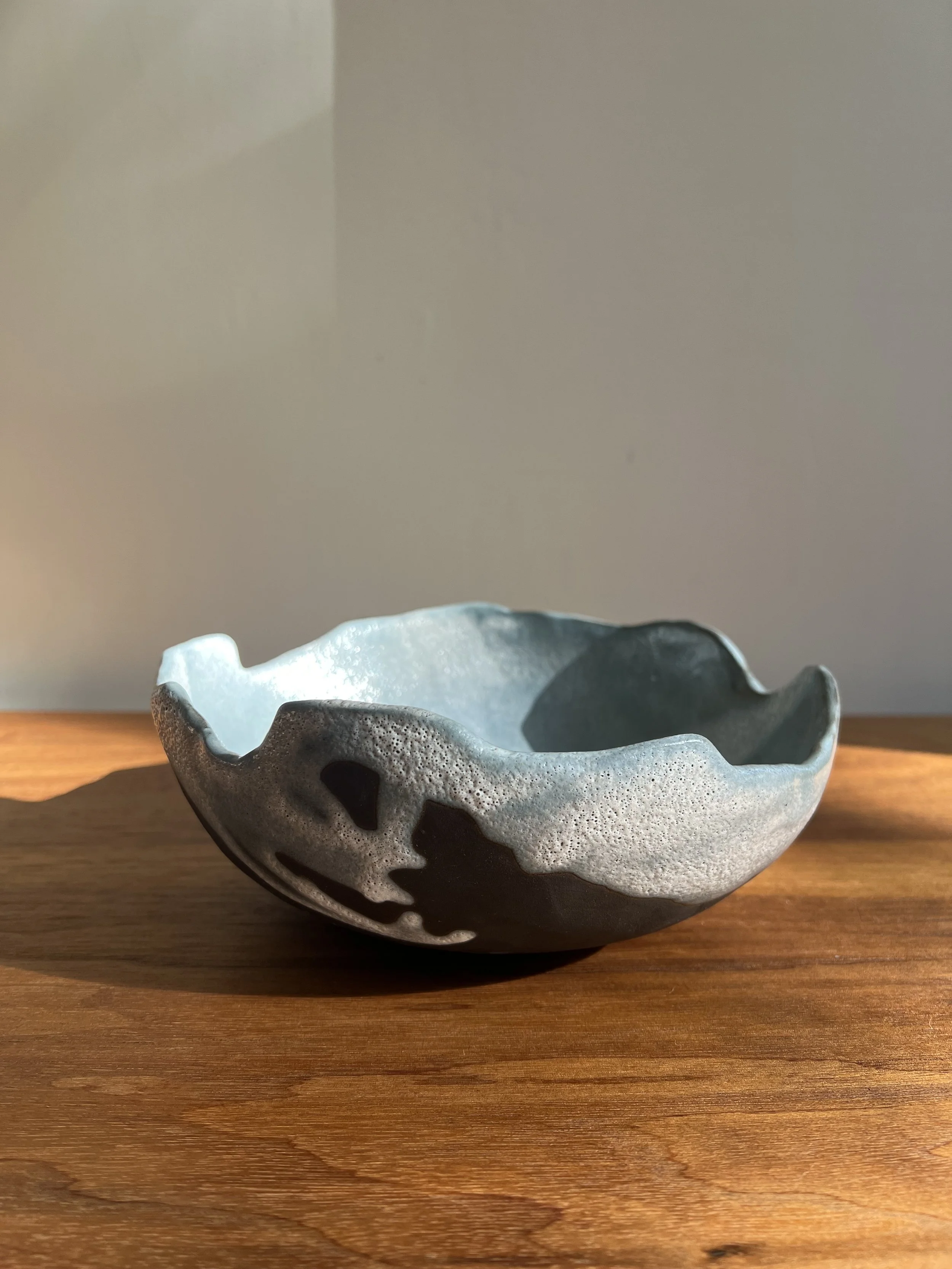 This piece from my Botanical Vessel series is a study in stoneware, designed to be a sculptural piece while retaining full functionality. The form features a distinctive, fluted stem supporting a wide bowl with a beautifully organic, free-form rim. The complex, speckled glaze catches the light, emphasizing the contrast between the linear base and the fluid top.